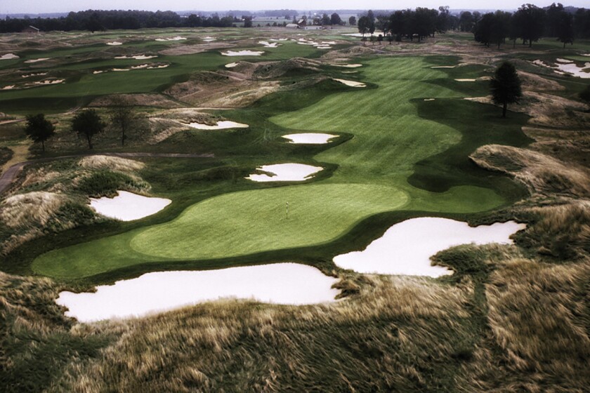 This long, slightly downhill par 4 requires a straight tee shot onto a narrow, winding fairway or you’ll end up in the bunkers. Its deep green presents another stern test of your skill. The hole is modeled after famed British golf course architect Alister Mackenzie’s favorite green at Michigan’s Crystal Downs.