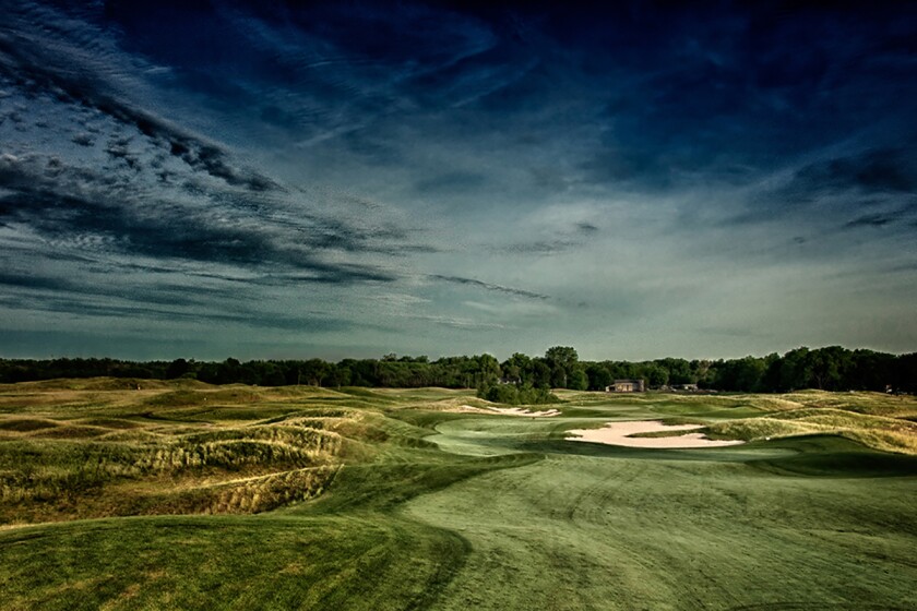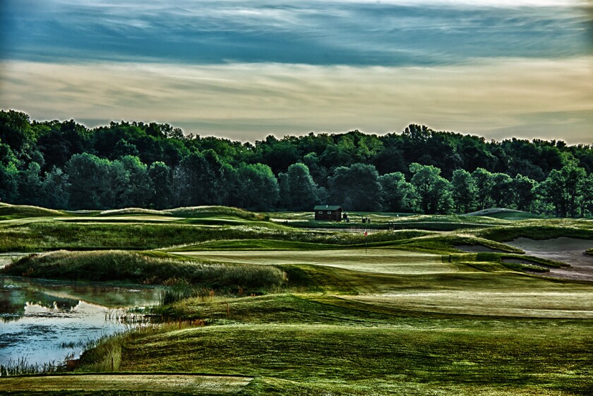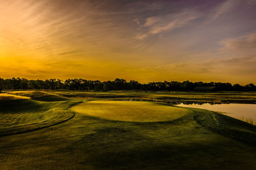 On this par 3, there are extra tees that set you up to hit over water. The green is surrounded by mounds with flowing fescue. Accuracy is important, as there are bunkers just short and right of the green, and a bent grass approach area to the left. Plus, a large bailout to the left makes for a tough up and down chip. Once you’re on the green, there are subtle undulations that can make putting a challenge.